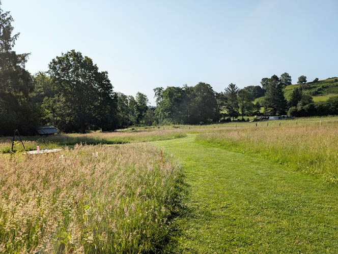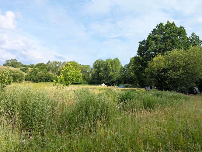 A flexible camping pitch in the meadow surrounded by long grass and wildflowers, with views up the valley.