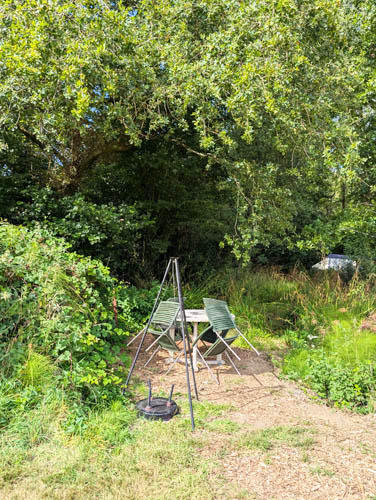 You will have your own compost loo, seating area, table, BBQ or firepit, and you will have access to the communal facilities of hot showers, washing-up area, water points and covered cafe/bar area.