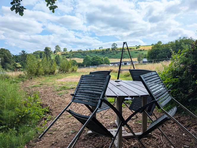 At the highest point on the campsite, views are over the paddock and across the valley on one side and into the woods at the back. We’re planting wildflowers all around to make another beautiful place to camp.